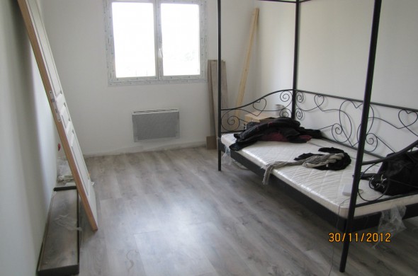 Parquet stratifié celtique, lit à baldaquin noir et pour la couleur des murs on verra un peu plus tard mais elle souhaite rose et noir.